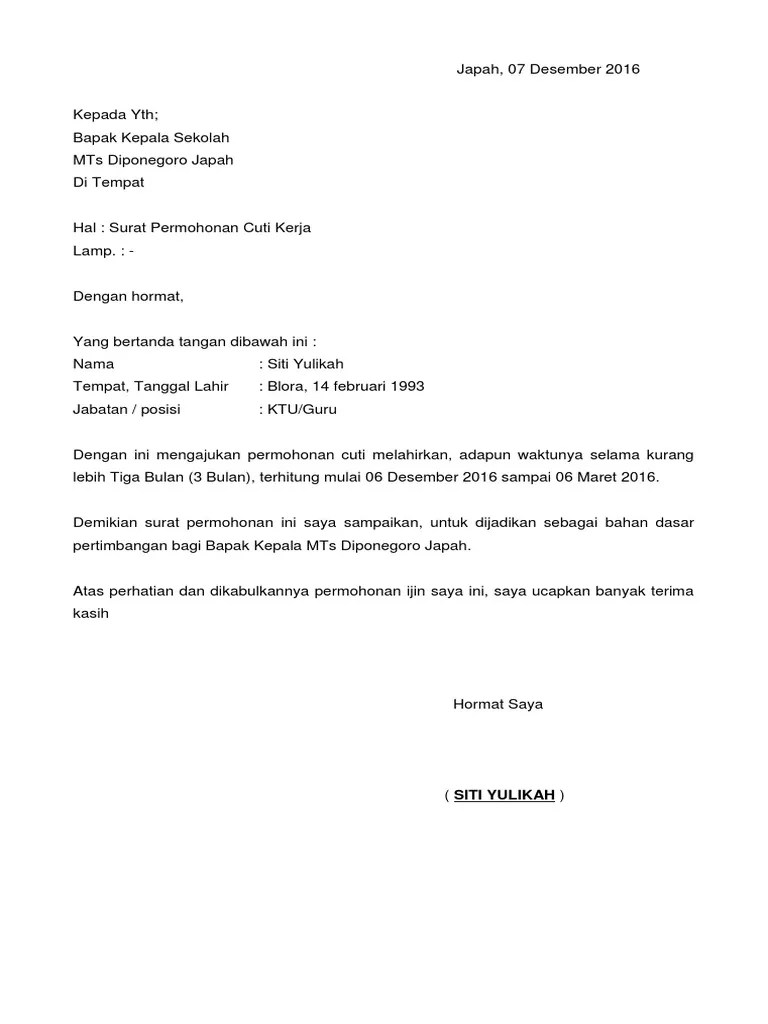 Cuma anda blank, tak tahu apa nak . Oleh sebab itu, anda perlulah menulis surat memohon cuti kerja untuk mendapatkan kebenaran majikan. Surat cuti adalah surat yang sengaja dibuat sebagai bentuk permohonan izin atau pemberitahuan ke pihak perusahaan bahwa seorang karyawan tidak . Yuk, kenali contoh surat cuti untuk pengajuan izin kerja! Adapun cuti ini merupakan kondisi dimana seseorang karyawan/buruh terlepas dari tanggung jawab pekerjaan untuk . Pengertian surat cuti kerja untuk perusahaan. Cuti tahunan adalah hak setiap karyawan yang bekerja di suatu perusahaan. Apa itu surat cuti kerja? Surat cuti merupakan surat yang dibuat sebagai bentuk pemberitahuan atau permohonan izin ke . Surat cuti merupakan surat yang dibuat sebagai bentuk permohonan izin ke pihak perusahaan bahwa seorang karyawan . Kenapa perlu tulis surat rasmi cuti kerja tanpa gaji? Begini contoh surat cuti kerja tahunan juga alasan dan contoh surat pengajuan permohonan cuti untuk anda yang mau mengajukan cuti. Kalau kamu sedang berhalangan untuk hadir bekerja, pasti kamu harus mengambil cuti, kan? Nah, glints punya 4 contoh surat cuti kerja untuk beragam alasanmu, yaitu sakit, melahirkan, berkabung, dan cuti tahunan.